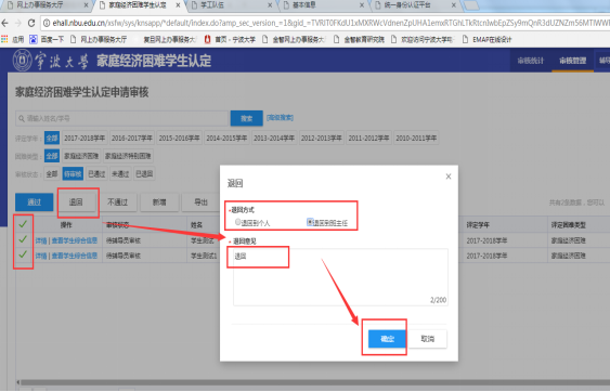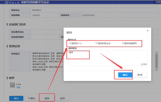 4、 退回操作:点击退回按钮,按照弹窗选择退回的环节,输入意见,点击确认,即送至所选退回环节。可以选择退回到学生个人、班主任、辅导员等(显示本岗位以下的环节)。