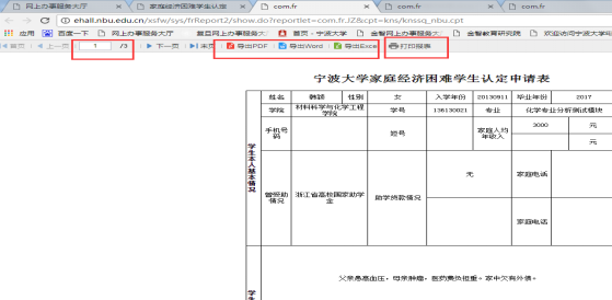 2、 “家庭经济困难学生认定申请表”如图所示,可进行导出和在线打印操作,其中导出支持pdf/word/excel三种格式。勾选多个学生“家庭经济困难学生认定申请表”的导出是导出一份多页的文件,每位学生占一页。