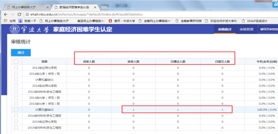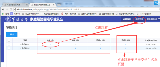 2.点击待审人数、送审人数、通过人数下的蓝色数字跳转至该班级相应审核页面。