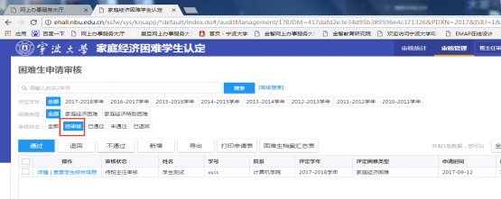 1.审核页面默认展示未经过筛选的全部学生数据,即全部学年、全部困难类型、全部审核状态的学生。点击筛选条件,可筛选学生。系统默认筛选条件有评定学年、困难类型、审核状态三个,也可在搜索框按照学号姓名搜索单个学生。