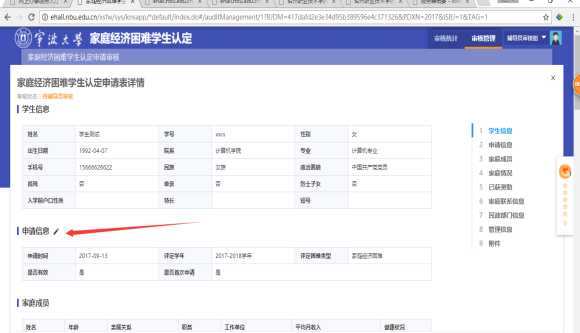 困难认定申请详情页面,查看审核学生填报的信息。