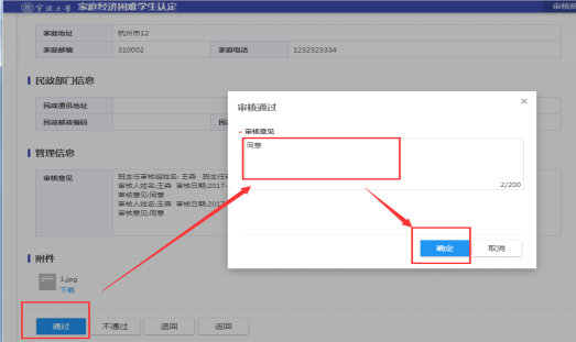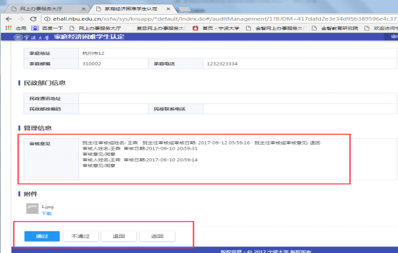 2、 进入某学生非学业因素详情页面,可查看学生填报的申请信息、家庭成员、家庭情况、已获资助、附件等信息。其中点击“申请信息”,老师可修改学生评定的困难类型。页面下方管理信息可查看申请流程其他环节办理情况。附件可在线浏览和下载,其中图片支持在线浏览,文档支持下载查看。信息审阅后点击底部“通过”、“退回”和“返回”进行相应操作。