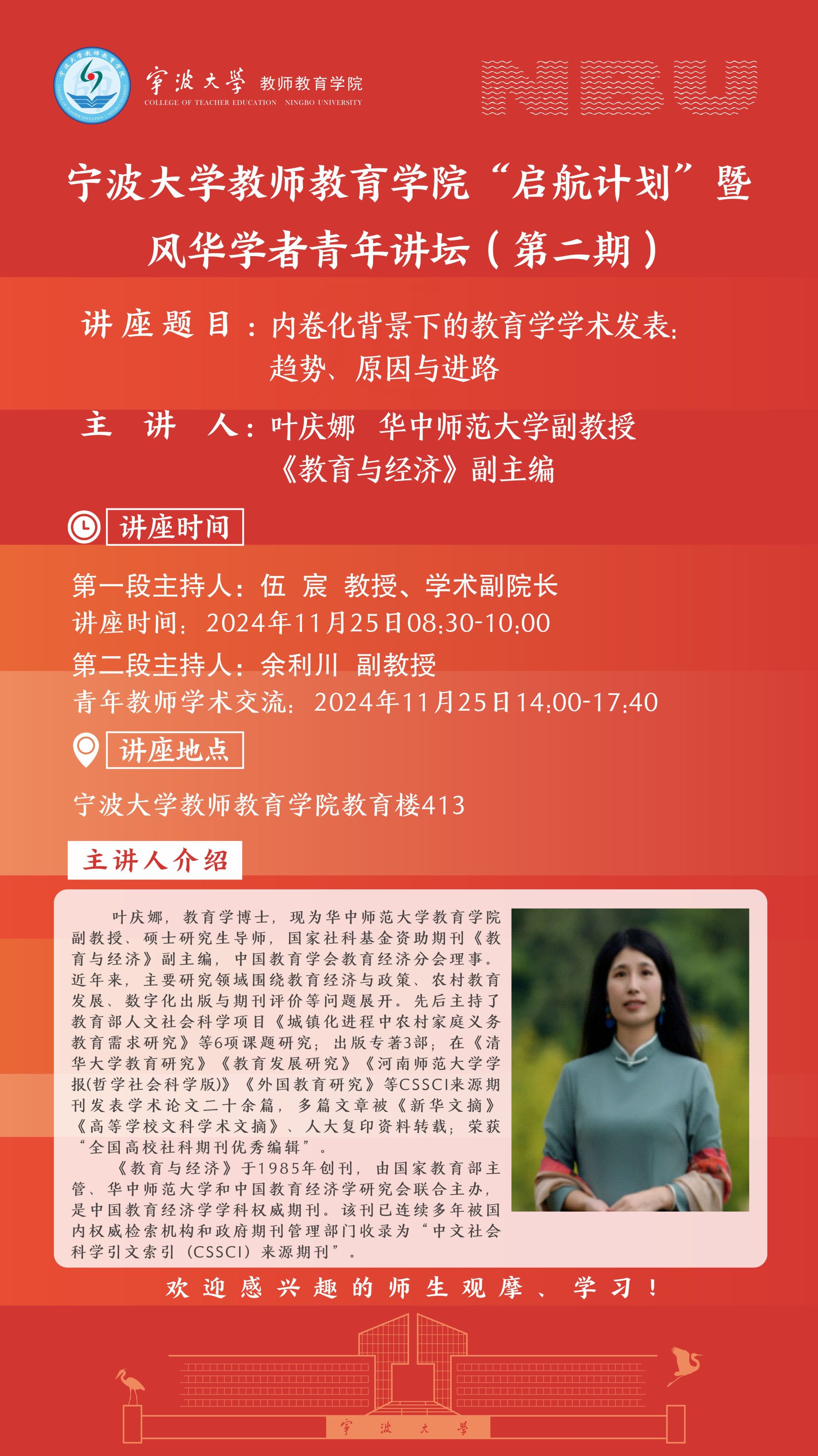 主讲人:叶庆娜,教育学博士,现为华中师范大学教育学院副教授、硕士研究生导师,国家社科基金资助期刊《教育与经济》副主编,中国教育学会教育经济分会理事。近年来,主要研究领域围绕教育经济与政策、农村教育发展、数字化出版与期刊评价等问题展开。先后主持了教育部人文社会科学项目《城镇化进程中农村家庭义务教育需求研究》等6项课题研究;出版专著3部;在《清华大学教育研究》《教育发展研究》《河南师范大学学报(哲学社会科学版)》《外国教育研究》等CSSCI来源期刊发表学术论文二十余篇,多篇文章被《新华文摘》《高等学校文科学术文摘》、人大复印资料转载;荣获“全国高校社科期刊优秀编辑”。