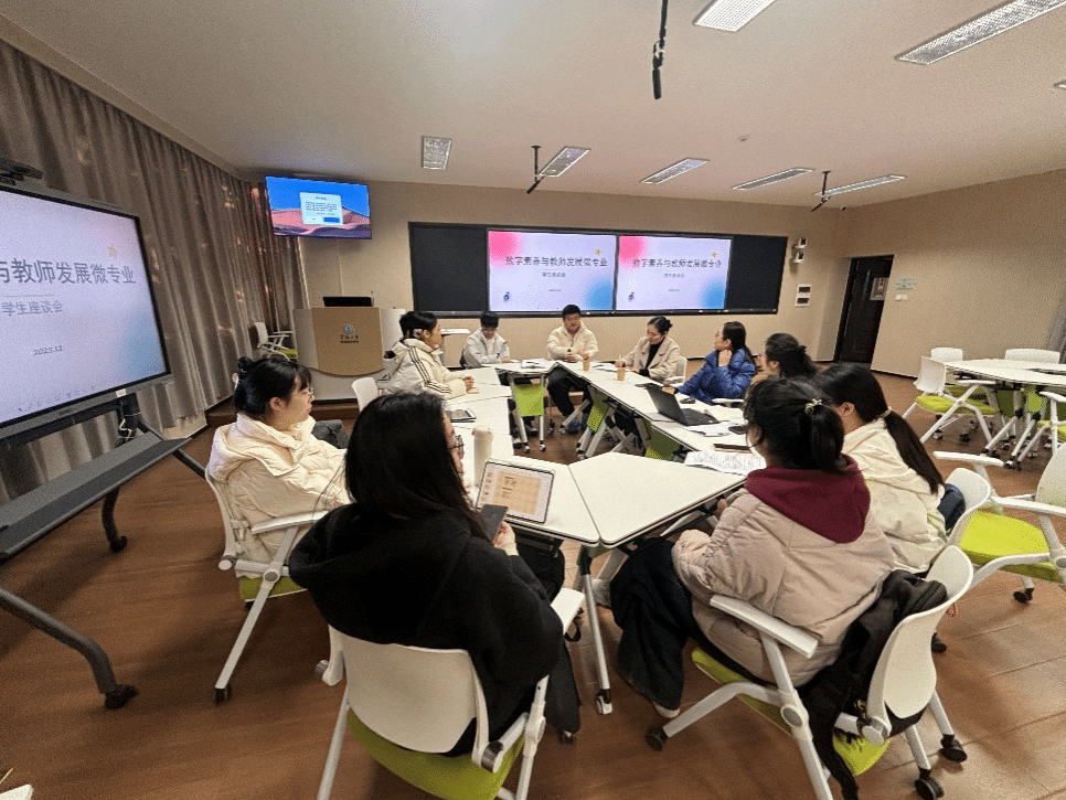 2025年12月17日下午,为了进一步深化教育教学改革,提升微专业建设质量,教师教育学院在308智慧教室召开了“数字素养与教师发展”微专业首期学员座谈会。出席座谈会的有宁波大学教务处副处长兼学院副院长李慧仙、微专业负责人戴洪珠、教务办主任吴菲菲以及首批微专业学员。会议围绕课程设置、教学模式、学习体验及就业前景等议题展开了深入交流。