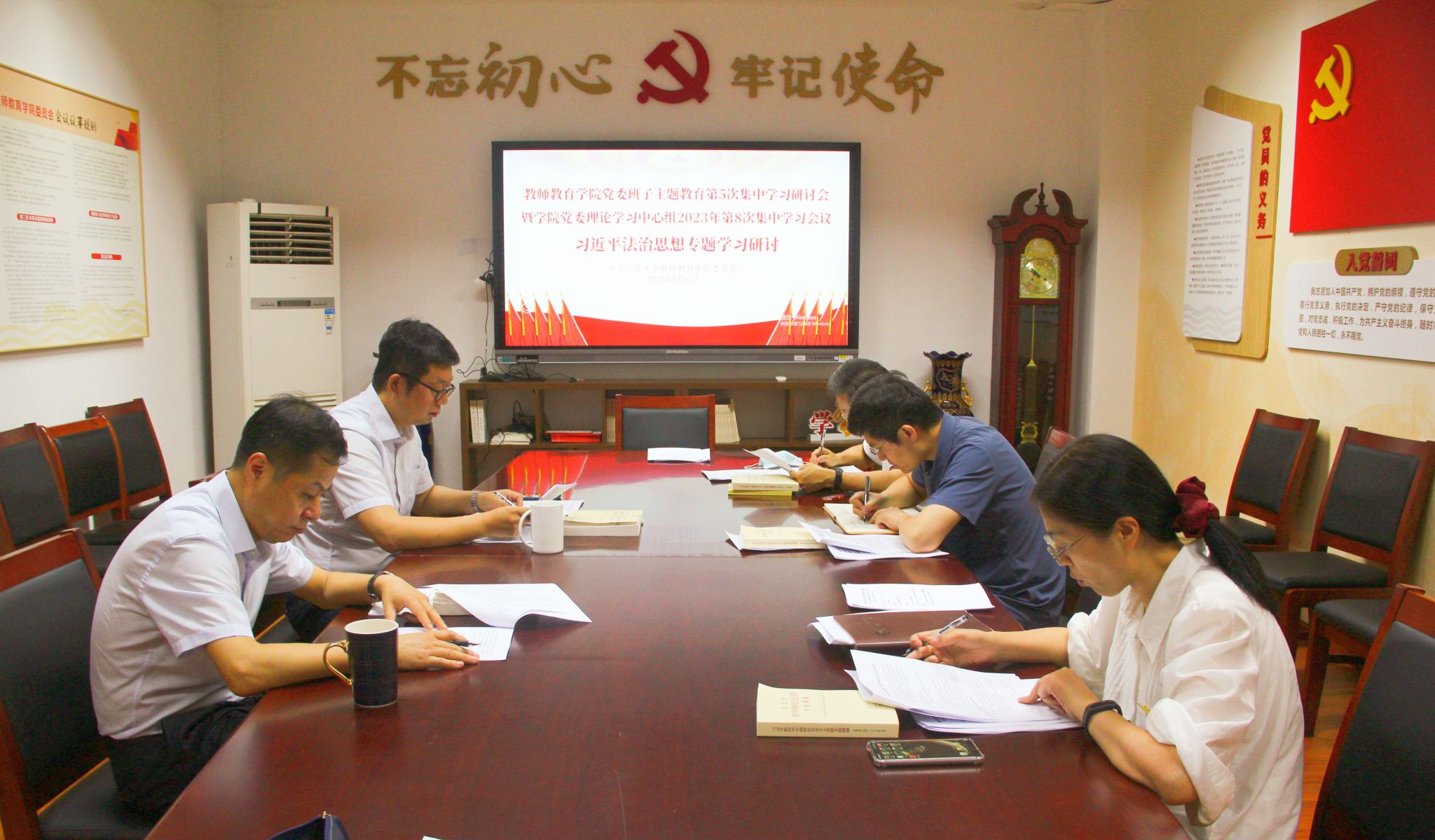 近日,教师教育学院党委理论学习中心组在实验楼426会议室召开主题教育第5次集中学习研讨会暨学院党委理论学习中心组2023年第8次集中学习会议。中心组围绕习近平法治思想开展专题集中学习。教师教育学院党委委员参加了此次会议。