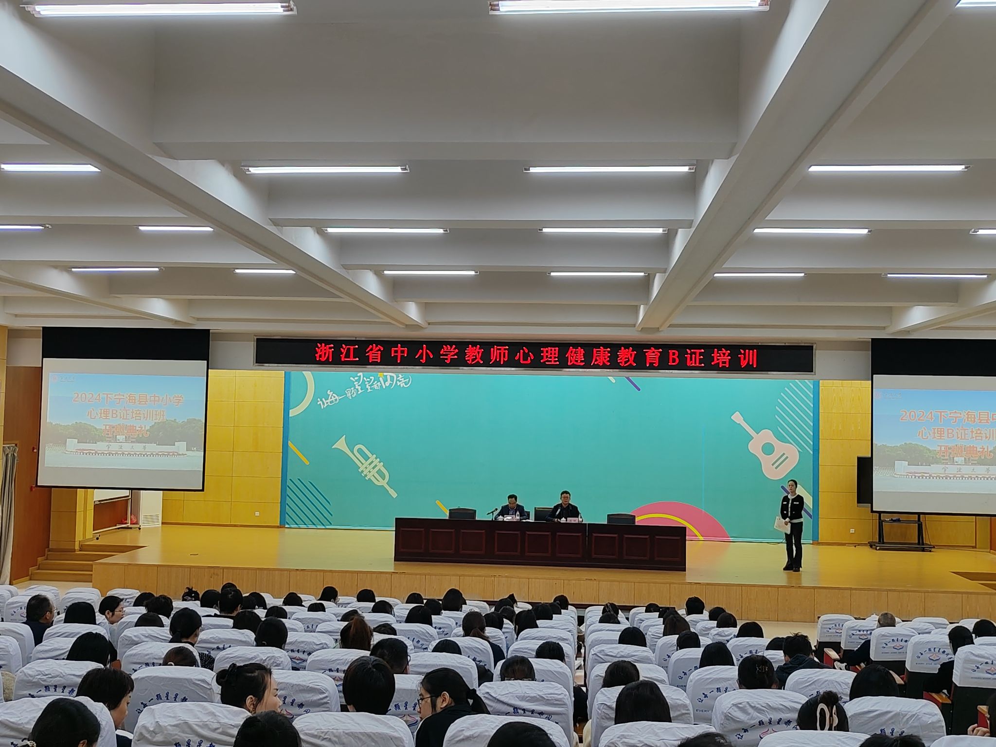 11月8日,由宁波大学教师教育学院承办的宁海县中小学教师心理B证培训1班和培训2班分别在宁海县星海小学报告厅和潘天寿小学(天明校区)报告厅隆重举行开班仪式。宁波大学教师教育学院党委书记张林、宁海县教育局副局长王建东出席开班仪式,共有360余名学员参训。会议由宁波大学教师教育学院培训部主任翁艳主持。