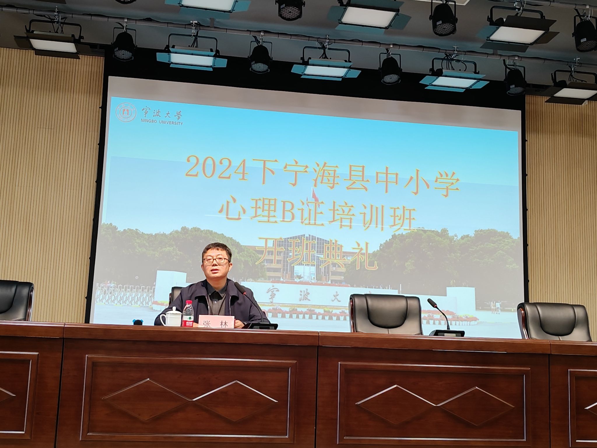 张林书记代表宁波大学教师教育学院致辞,他首先对宁海县教育局的信任和支持表示衷心的感谢,对前来参训的学员表示热烈的欢迎。张林在致辞中强调了心理健康的重要性,他指出参加本次培训不仅可以帮助参训教师提升心理健康教育教学的业务水平,还可以提升教师队伍自身的心理健康水平。