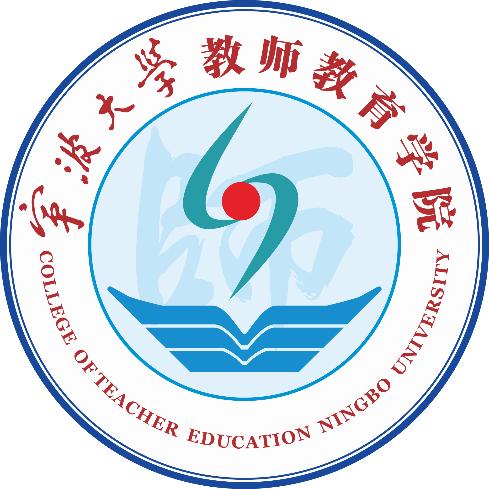 宁波大学教师教育学院院徽整体呈同心圆结构,外环以深蓝为底色,镶嵌中英文院名;内圈将“师”字静立成知识的大门,“院”字活化为青绿色曲线的飞鸟,再以船型的书本图案奠基,巧妙植入了宁波“书藏古今”“港通天下”的地域文脉,彰显出学院深邃的历史底蕴与国际化视野。